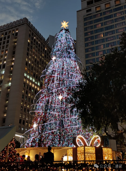 中環皇后像廣場花園北面設有20米高聖誕樹。(香港中通社記者 黃璇攝) 中環皇后像廣場花園北面設有20米高聖誕樹,四周佈置玩具主題裝置,節日氣氛濃厚。由11月底起,聖誕市集登場,12間聖誕小木屋匯聚美食、精品及限定工作坊。八大地標建築,包括中國銀行大廈、終審法院大樓、香港大會堂等,聯合呈獻3D燈光匯演,結合投影、燈光和音樂,打造奪目表演。