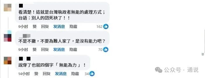對於台當局不撤僑的“解釋”,網友表示,“把撤出兩人當樣板,掩蓋無能的真相,干話一堆,戰地比台灣安全?連推責都無能。”“這就是台灣執政者無能的處理方式,別人的小孩死不完。” 許多網友諷刺,“不是不撤僑,是沒有能力撤。”“說穿了也就四個字:無能為力 !”“這些僑民沒有票,所以不用管?”有網友則“借用”泛綠陣營的台北市議員苗博雅的話,“戰爭是可以正常上班上課的,所以不影響不用撤離。”