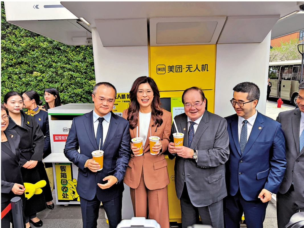 這是一場充滿“煙火氣”的科技體驗。在美團創辦人王興的陪同下,鄭麗文親手在手機上下單點了一杯珍珠奶茶。短短十幾分鐘後,伴隨著旋翼的嗡鳴聲,一架無人機攜帶外賣精降落在指定取餐點。