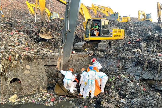 2026年3月9日,印度尼西亞班塔爾格邦垃圾填埋場發生坍塌事故,救援人員在事故現場搜救。新華社圖片