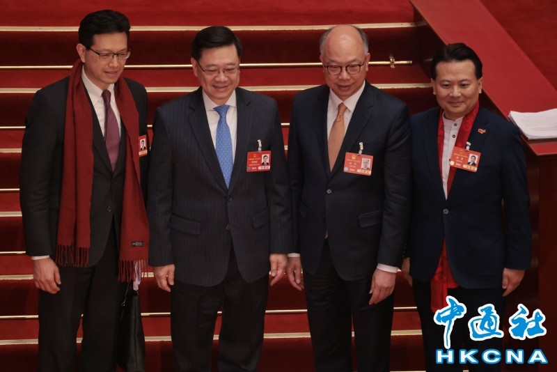 3月5日,香港特區行政長官李家超(左二)與全國人大代表吳秋北、陳勇、陳帆合照。香港中通社圖片 李家超當天透過特首辦發佈,祝願全國兩會圓滿成功。他說,今年是“十四五”規劃收官之年、開展“十五五”規劃編制工作之年,也是進一步全面深化改革的重要一年,對“一國兩制”實踐具有重要意義。香港特區政府會繼續全面準確、堅定不移貫徹“一國兩制”、“港人治港”、高度自治的方針,團結社會各界進一步全面深化改革,主動識變應變求變,更好發揮“一國兩制”制度優勢和香港獨特的國際化優勢,打開發展新天地,並全力發展經濟、改善民生,發掘新增長點。 李家超表示,香港特區政府會以創新思維結合市場力量,推進北部都會區和河套深港科技創新合作區發展,加快發展國際創新科技中心建設;並鞏固提升香港國際金融、航運、貿易中心地位,打造國際高端人才集聚高地;同時進一步推動粵港澳大灣區高質量發展建設,積極融入國家發展大局;並提升國際競爭力,深化國際交往合作,強化內聯外通的橋樑作用,實現香港更好發展,為強國建設、民族復興作出更大貢獻。(完) 【編輯:胡雪石】