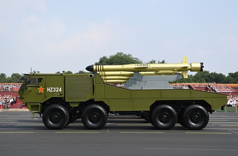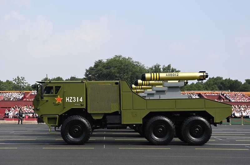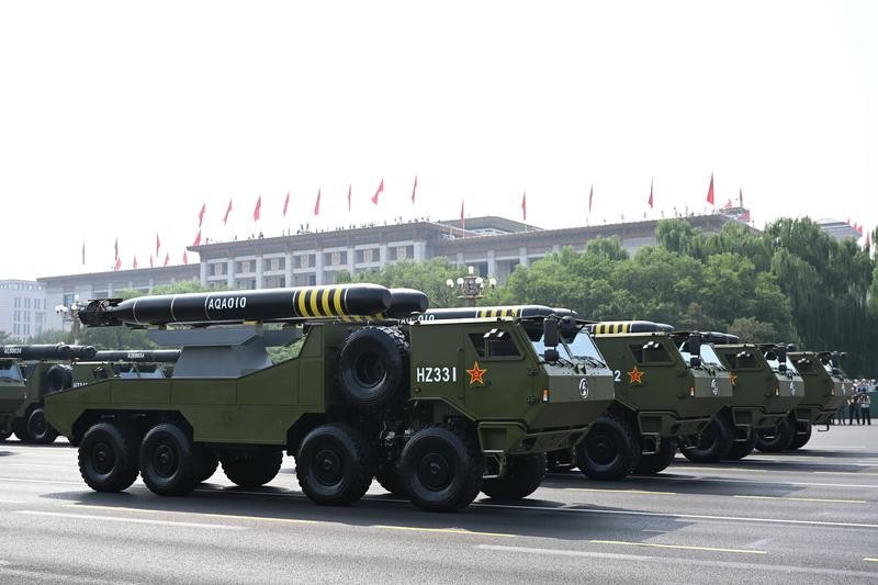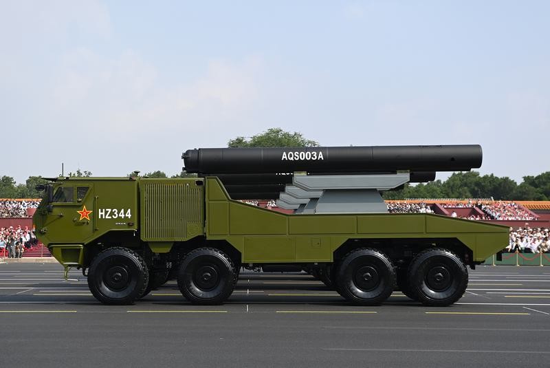 9月3日上午,紀念中國人民抗日戰爭暨世界反法西斯戰爭勝利80周年大會在北京天安門廣場隆重舉行。圖為水下兵器方隊在接受檢閱。圖片來源:新華社