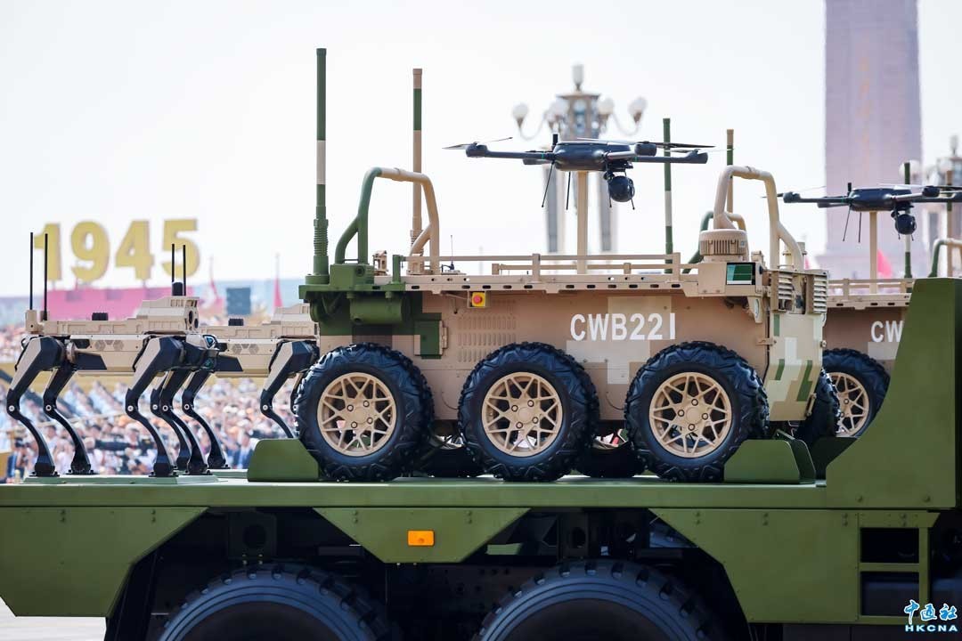 陸上無人作戰方隊接受檢閱。受閱裝備為偵打突擊、掃雷排爆、班組支援等無人戰車。(香港中通社記者 謝光磊攝)