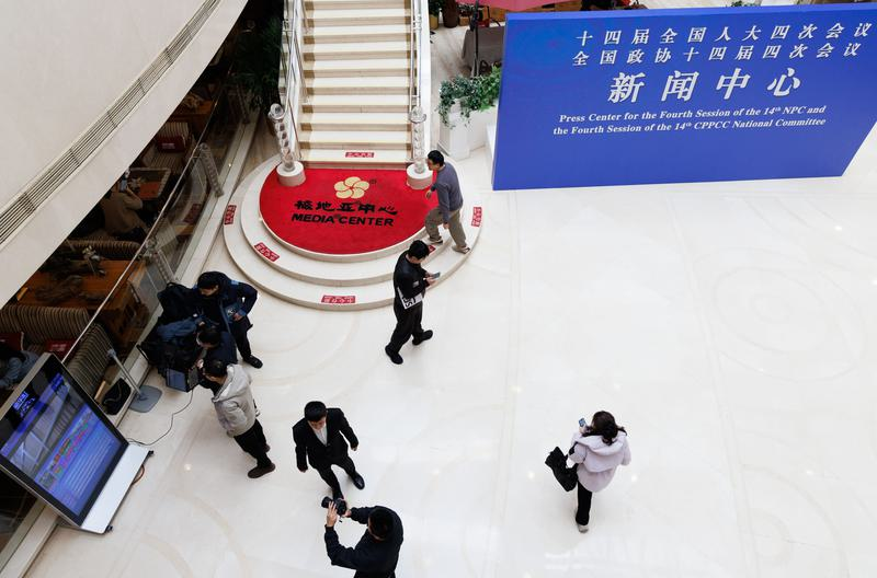 2月27日,媒體記者和工作人員在全國兩會新聞中心忙碌。新華社照片