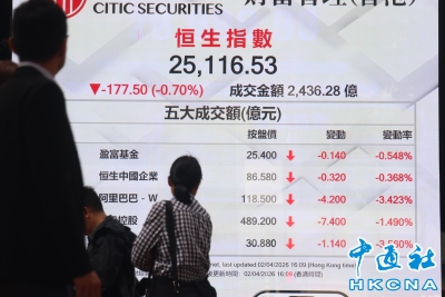 香港恒生指數跌177.5點 報25116.53點收盤