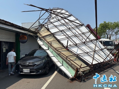 台灣桃園龍潭廣告帆布倒塌壓毀路邊轎車
